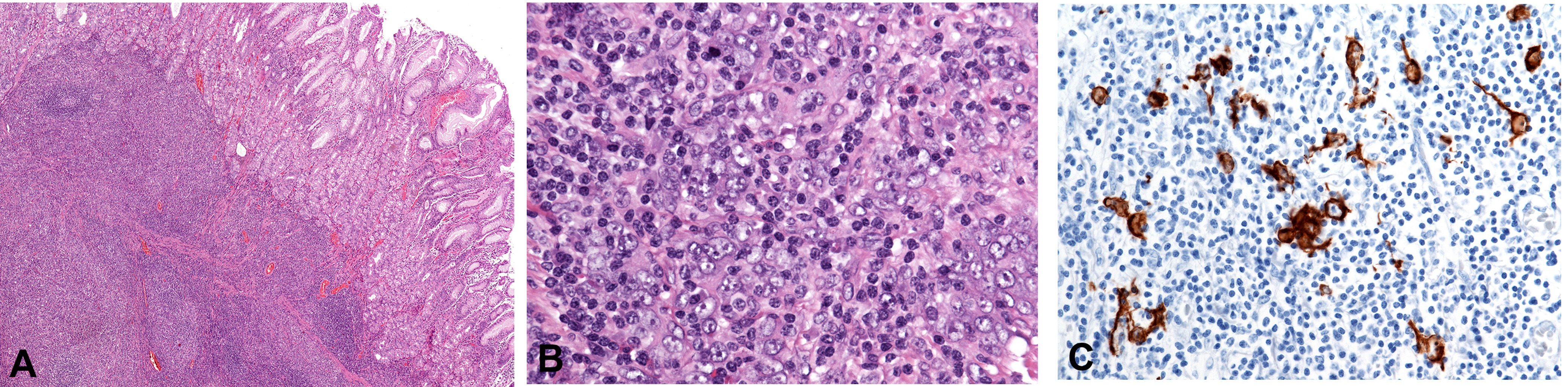In 1990, Burke et al. [12] first described a "lymphoepithelial gastric carcinoma" that was associated with EBV. Three additional cases that were likewise positive for EBV were reported in the subsequent year by another group [13]. It is of note, however, that not all EBV-associated gastric cancers bear a dense lymphocytic component. Thus, EBV-infection may be detected in "classical" tubular or tubulopapillary adenocarcinomas that lack a dense inflammatory infiltrate. In the study by Chang et al. [14], EBV infection was detected in 30 out of 45 (67%) gastric cancers with lymphoid stroma, but also in 10 out of 292 (3.4%) consecutive cases of gastric carcinomas without lymphoid stroma (p < 0.05). In another study, four out of 52 (8%) conventional carcinomas were EBV positive [15].