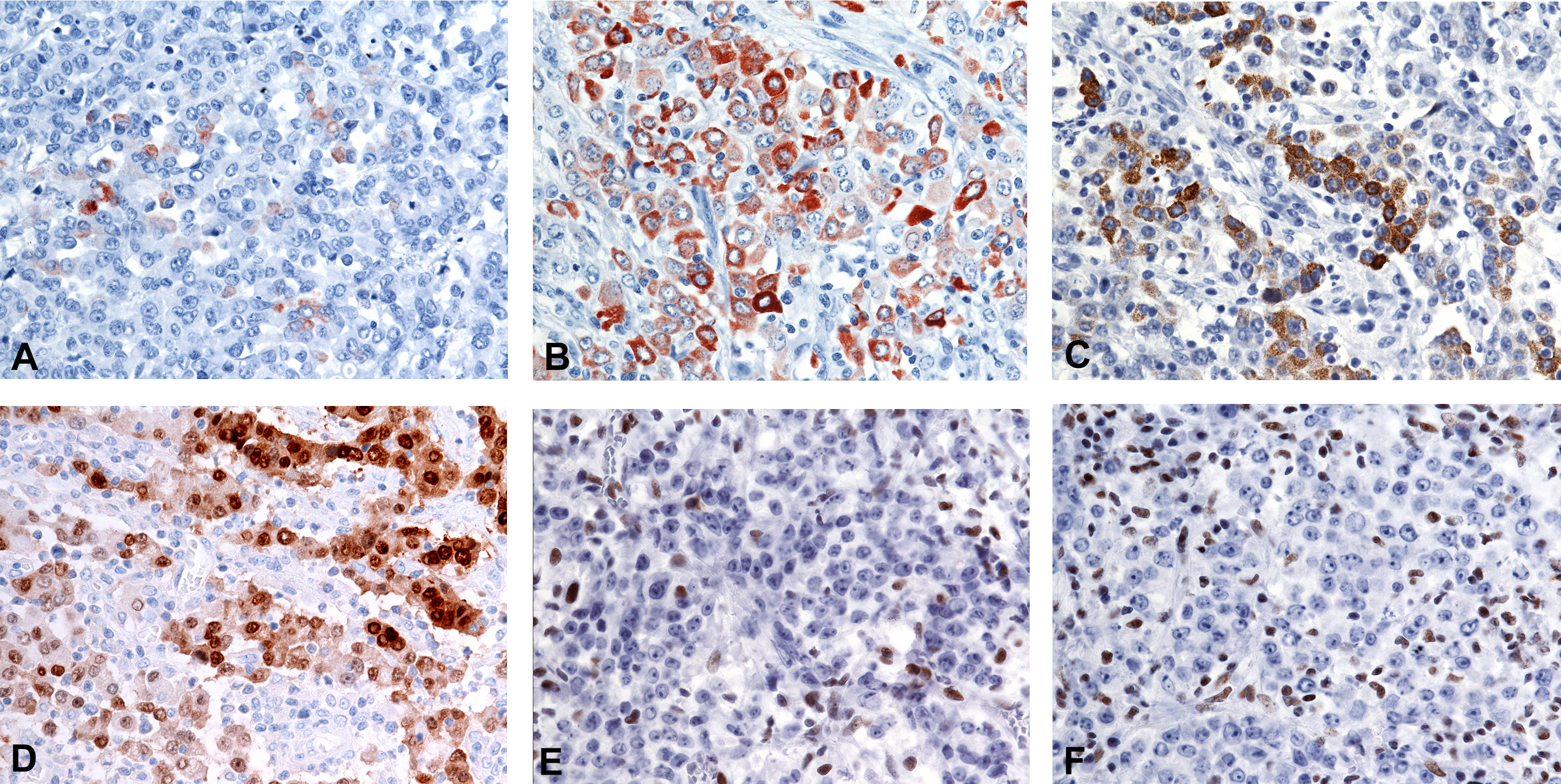 Figure 4. The diagnosis of medullary carcinoma often needs immunohistochemical confirmation, which, however, includes several important pitfalls. Quite often the tumour cells are only weakly of focally positive for keratin 20 (A). When a tumour like that is positive for keratin 7 (B) this may imply major diagnostic problems, especially if biopsy material is evaluated. Positivity for MUC2 (C) and CDX-2 (D) may be of help, but the expression of these markers is variable. As medullary carcinomas almost invariably show high-level microsatellite instability (MSI-H) staining loss of nuclear MLH1 (E) and PMS2 expression (F) may be the key step to accurate diagnosis (note the positive staining of intratumoural inflammatory cells serving as internal positive control).