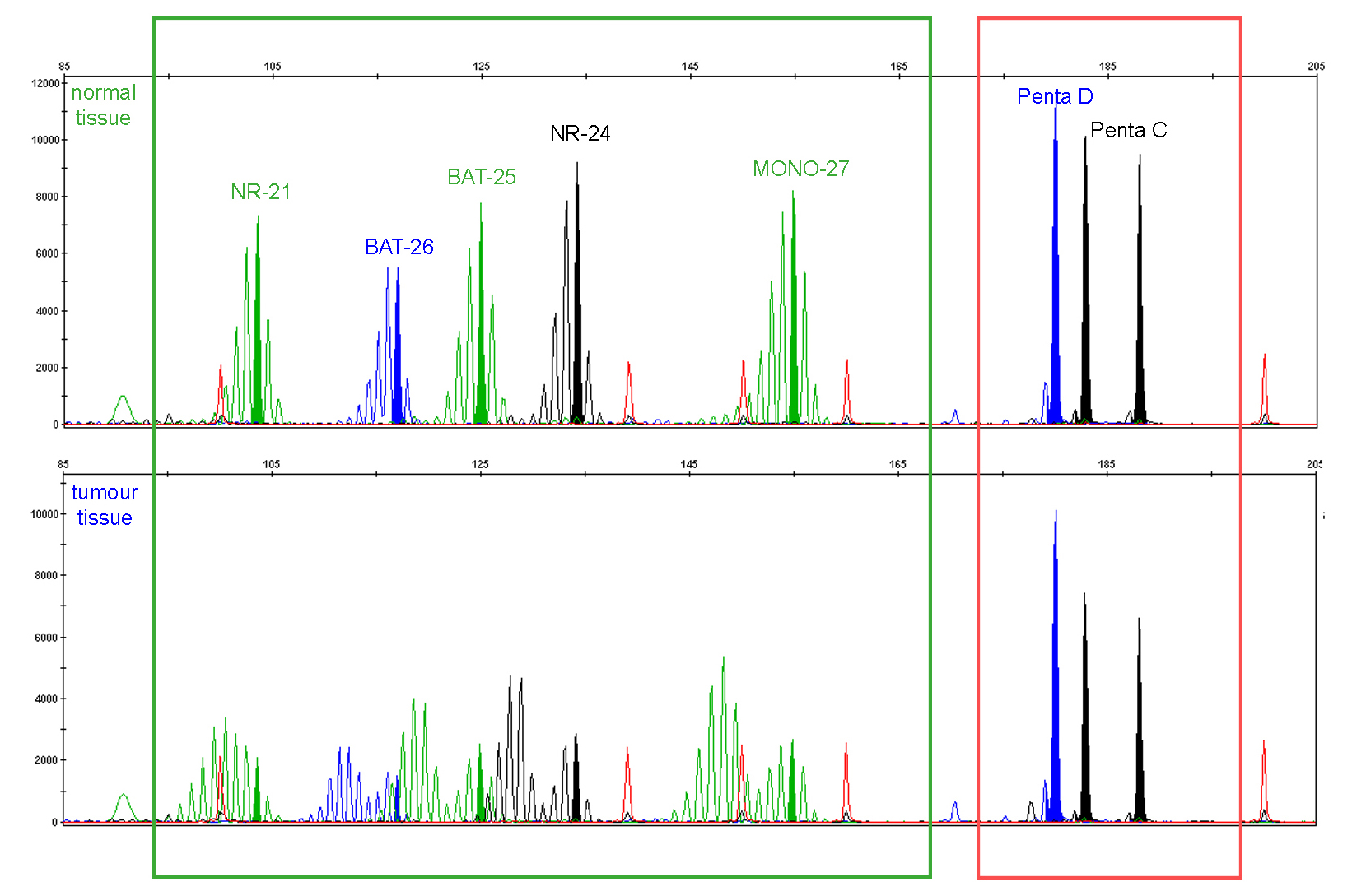 Figure 5. Example of a medullary colon cancer with high-level microsatellite instability (MSI-H). The MSI profile assessed by a panel of five nearly monomorphic mononucleotide repeats (pentaplex panel) illustrates instability for all markers, as shown by additional alleles (allelic shifts). Two polymorphic pentanucleotide repeats (Penta C and Penta D) are included for sample identification.